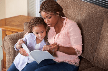 A mother reads aloud to her child.