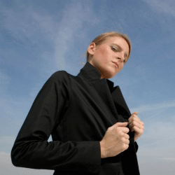 Her expression is one of disdain.