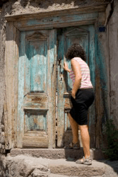 Before entering, the woman pauses with her foot on the doorsill.