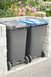 A pair of plastic dustbins.