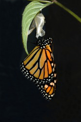 A butterfly emerging from its cocoon.