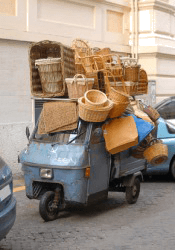 A motorcycle encumbered with baskets.