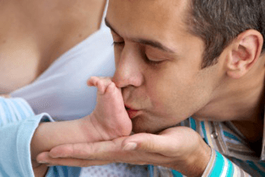 A father kisses his babys foot in an act of endearment.