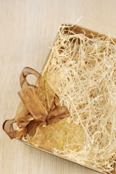 A gift box filled with excelsior.