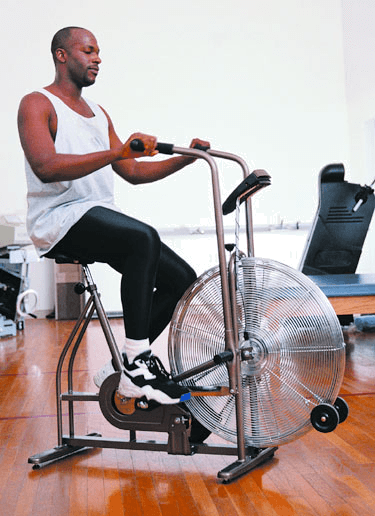 exercise bicyclen.(名词) PhotoDisc, Inc.- A stationary piece of fitness equipment having a saddle seat, handlebars, and pedals that can be adjusted to a desired degree of tension, pedaled chiefly to strengthen the user's cardiovascular system. Also called stationary bicycle 健身自行车:具有鞍型座、把手和脚踏板的固定健身设备。其脚踏板可以调整到所需的张力程度,踩踏板主要用来增强使用者的心血管功能 也作 stationary bicycle
