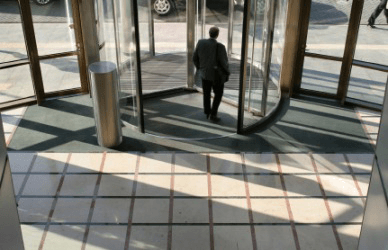 A man exits a building.