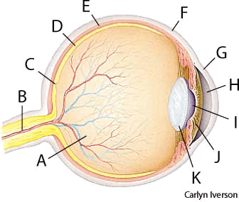 eye AHD[ī] D.J.[aɪ]K.K.[aɪ]n.(名词) eyetop: cross section of a human eyeA. vitreous humorB. optic nerveC. fovea centralisD. retinaE. choroidF. scleraG. corneaH. aqueous humorI. pupilJ. irisK. lensbottom: the eye of hurricane Catarina, off the coast of Brazil in 2004, as seen from the International Space Station  - An organ of vision or of light sensitivity.眼睛:感受视觉或光觉的器官