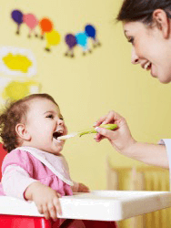 A mother feeding her baby.
