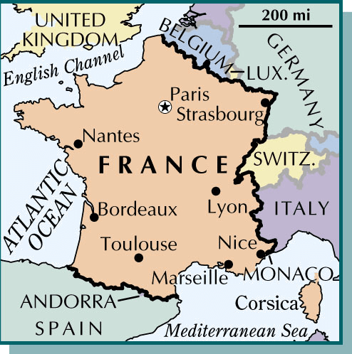 1. A country of western Europe on the Atlantic Ocean and the English Channel. It was settled by the Franks after the retreat of the Romans, who had conquered Celtic Gaul in 58-51b.c. Charlemagne made it the center of his Empire of the West after a.d. 800. In the Middle Ages France was split into numerous fiefdoms and kingdoms, most of which were incorporated into the royal domain by the time of Louis XI (reigned 1461-1483). Widespread poverty and discontent led to the French Revolution (1789), the excesses of which contributed to the rise of Napoleon Bonaparte (1799). Much of France was occupied by the Germans in World War II. Paris is the capital and the largest city. Population, 54,334,871. 法国:欧洲西部一国家,在大西洋和英吉利海峡沿岸。公元前 58至51年征服克尔特的高卢的罗马人撤退以后,法兰克人移民于此 公元 800年以后,查理曼使此地成为他的西方帝国的中心。中世纪,法国被分成无数采邑和王国,路易十一世时(1461-1483年在位)其中多数采邑和王国被合并为属于王室的领域。普遍的贫困和不满情绪引发了法国革命(1789年),进一步恶化的贫困和不断激化的不满促成了拿破仑的崛起(1799年)。法国大部分领土在二战中被德军占领,巴黎是首都和最大城市。人口54,334,871