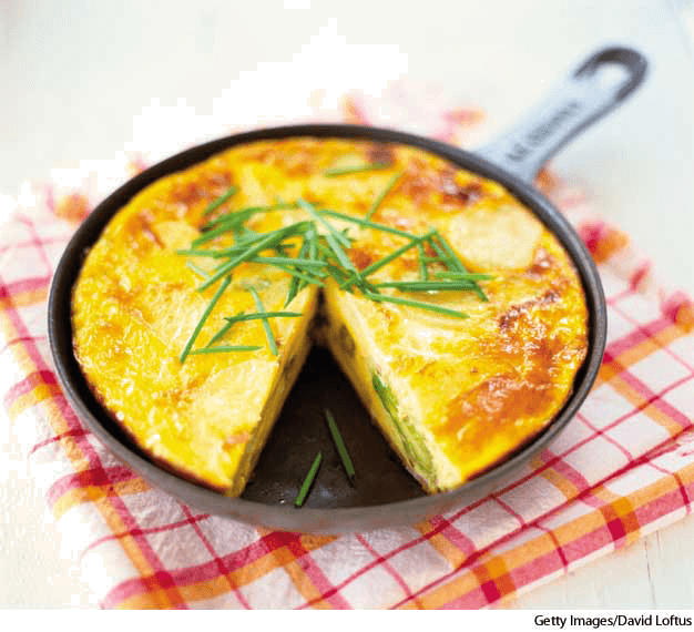 1. An open-faced omelet, often cooked with meat, cheese, or vegetables.菜肉馅煎蛋饼:一种有馅但无上面一层的煎蛋卷,常和肉、奶酪和蔬菜一起烹调