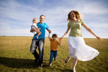 A family frolics in a field.