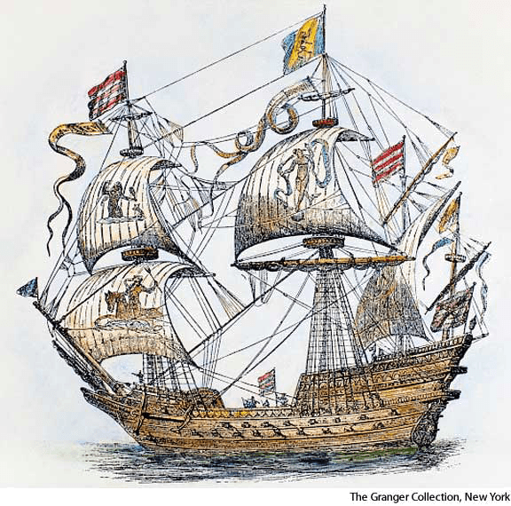 gal·le·on AHD[gălʹē-ən, gălʹyən] D.J.[ˈgæliːən, ˈgæljən]K.K.[ˈgæliən, ˈgæljən]n.Nautical(名词)【航海】 galleon- A large three-masted sailing ship with a square rig and usually two or more decks, used from the 15th to 17th century especially by Spain as a merchant ship or warship.大型横帆船:15世纪至17世纪所用的一种大型三桅帆船,通常有两层或更多的甲板,尤其被西班牙用作商船或战舰