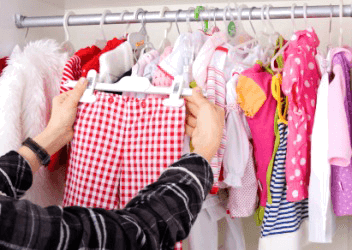 A woman choosing a garment for a child.