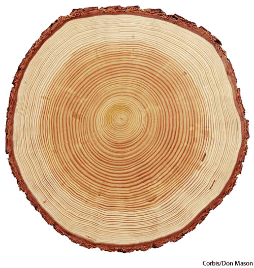 年轮:一年里树木长出的层。从截面上看年轮呈同心圆状