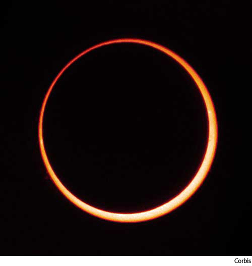 日环蚀:一种除了外圈有一个明亮的环,太阳的其余部分都被月亮遮住的日蚀