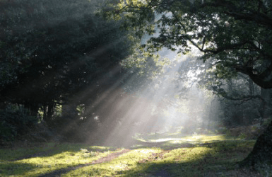 Sunlight streams into a forest glade.