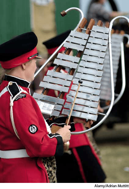 glock·en·spiel AHD[glŏkʹən-spēl', -shpēl'] D.J.[ˈglɒkənˌspiːl, -ˌʃpiːl]K.K.[ˈglɑkənˌspil, -ˌʃpil]n.Music(名词)【音乐】 glockenspiel- A percussion instrument with a series of metal bars tuned to the chromatic scale and played with two light hammers.钟琴:按半音阶调准的分级金属棒构成的打击乐器,用两个轻槌击奏