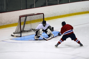 A hockey player guards the goal.