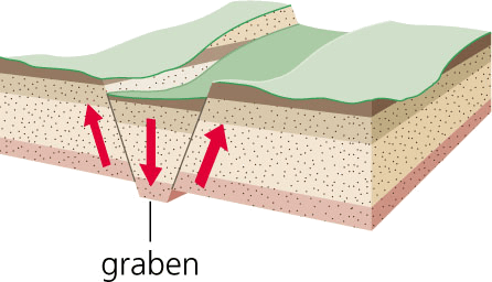 gra·ben AHD[gräʹbən] D.J.[ˈgrɑːbən]K.K.[ˈgrɑbən]n.(名词) Precision Graphics- A usually elongated depression between geologic faults.地堑:在两个地质断层之间的,通常很长的地壳下降部分