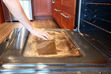 The oven looked brand new after she removed the grimy buildup on the inside of the glass door.