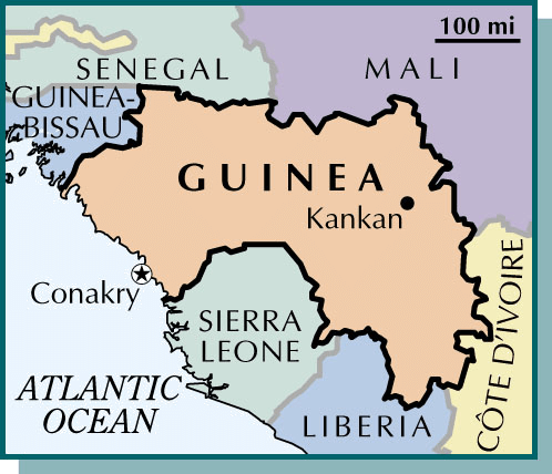 Guin·ea AHD[gĭnʹē] abbr.缩写 Guin.D.J.[ˈgɪniː]K.K.[ˈgɪni]NONE(无词性) - A country of western Africa on the Atlantic Ocean. It was a French colony from 1898 until 1958, when it gained its independence. Conakry is the capital and the largest city. Population, 4,830,000.几内亚:非洲西部一国家,位于大西洋沿岸。从1898至1958为法国殖民地,1958年赢得独立。科纳克里为该国首都及最大城市。人口4,830,000