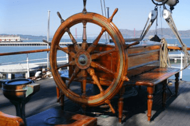 The helm of an old sailing ship.