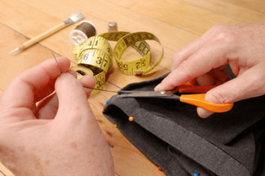 A woman puts a hem on a garment.