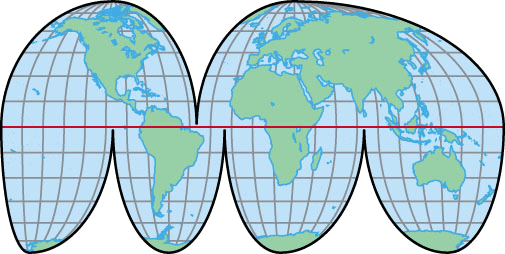 ho·mol·o·sine projection AHD[hō-mŏlʹə-sīn', -sĭn, hə-] D.J.[həʊˈmɒləˌsaɪn, -sɪn, hə-]K.K.[hoˈmɑləˌsaɪn, -sɪn, hə-]n.(名词) Jerry Malone- A map of the earth's surface laid out on the basis of sinusoidal curves, with the interruptions over ocean areas distorted so that the continents appear with minimal distortion.等面积投影:在正弦曲线基础上所绘地球表面之地图,因海洋地区的断层扭曲,因而大陆部分显示微小的变形