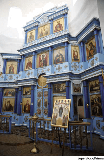 1. The screen decorated with icons that divides the sanctuary from the nave of an Eastern Orthodox church.圣像屏帏:东正教教堂中把圣殿与广场隔开的饰有圣像的屏风