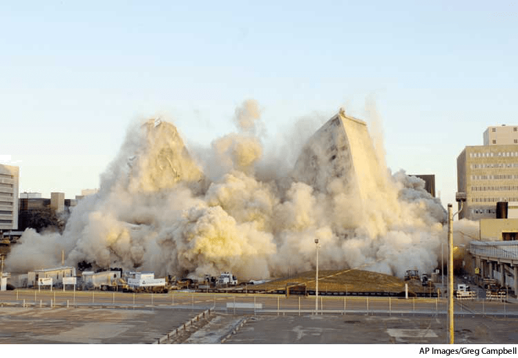 - The inward collapse of a building that is being demolished in a controlled fashion by the weakening and breaking of structural members by explosives.内爆拆除:用爆炸的方法削弱或弄断结构支架,从而按控制好的方式拆除的房子向内崩塌
