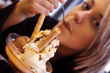 A girl indulges in a large ice cream sundae.