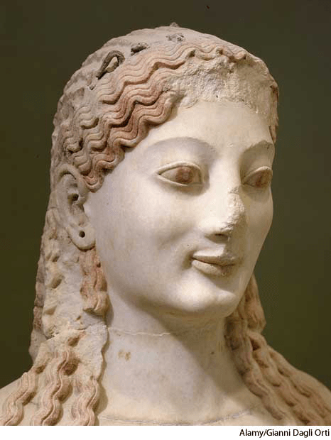 archaic smilen.(名词) archaic smilec. 530 bc marble kore attributed to sculptor Phaidimos- A representation of the human mouth with slightly upturned corners, characteristic of early Greek sculpture produced before the fifth centuryb.c. 早期希腊雕像特有的笑容:有着微微上翘嘴角的人嘴的形式是公元前 5世纪之前制作的希腊雕像的特征